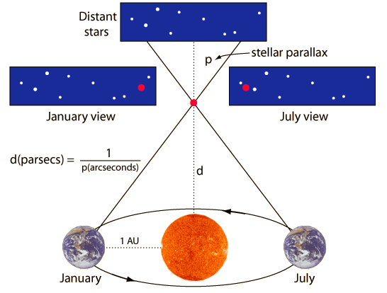 The most common and primary method of measuring a star’s distance from us is by using a method that we call stellar parallax. This works by looking at a star twice in the year, when we are at the opposite points of our orbit around the sun. The background to which it moves relative to us as observers gives us an accurate idea of its distance from us.