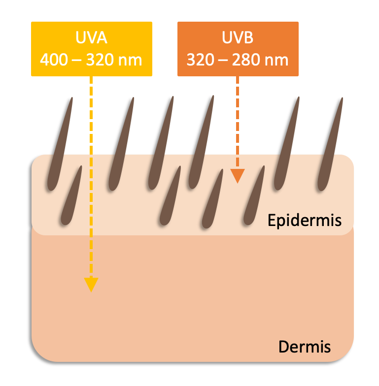Even though the sun is almost 150 million kilometres away from us, its UV rays are still able to cause significant damage to humans here on Earth. Whilst UV radiation is able to mutate your DNA and promote the formation and growth of tumours, it is also beneficial to us as it facilitates the natural production of vitamin D as well as endorphins in the skin.1 UV radiation can be split into three categories depending on wavelength, UVA (320 – 400 nm), UVB (280 – 320 nm) and UVC (200 – 280 nm), with only UVA and UVB reaching the earth’s surface since UVC rays are mostly absorbed by ozone in the atmosphere.