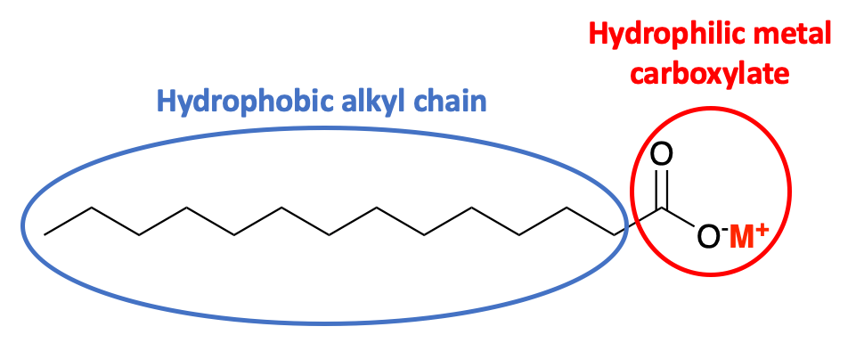 The R group in soap is a long alkyl chain, made up of numerous CH2 groups and a terminal CH3 group. These types of groups are very hydrophobic, meaning they do not like to be in water. The metal carboxylate group is the opposite as the charges on the oxygen and the metal make this part of the structure hydrophilic, meaning they interact favourably with the surrounding water.