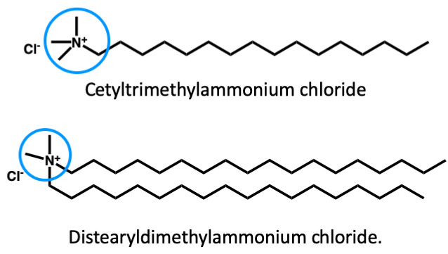 Conditioners contain cationic surfactants (figure 3), molecules which possess a positive charge. Strands of hair are negatively charged due to the deprotonation of amino acids that make up outer layer of the hair, and so when you put conditioner on your hair, the cationic surfactant molecules will preferentially deposit on the surface of the hair.4 Once the positively charged surfactant molecules bind to the negatively charged hair, the overall coupling results in neutralisation and therefore reduces the overall charge of a person’s hair, reducing static. Conditioners also contain polymers which help to detangle hair, as well as silicones which are heat resistant and work to lubricate hair strands, adding gloss and shine.