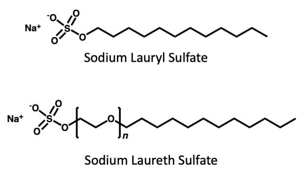 We use shampoo to remove the excess sebum from our scalps as water alone cannot. The composition of sebum, as seen in figure 1B, is predominantly made up of oily, fatty molecules which cannot dissolve in water. Similar to when cleaning dishes (https://glamsci.blog/2019/05/08/why-we-need-soap-to-clean-dirty-dishes/), some form of surfactant must be added to allow water to dissolve and remove the oily components. The primary surfactants present in most shampoos used to be lauryl sulfates (figure 2), compounds chosen for their ability to clean as well as foaming capabilities.2 Whilst many shampoos still contain lauryl sulfates, more recently laureth sulfates (figure 2) have been preferred by manufacturers as they show a decrease in irritation when in contact with the eyes. Shampoos are designed to not only clean the hair, but to also leave behind a pleasant, fresh smell to the hair once washed off.