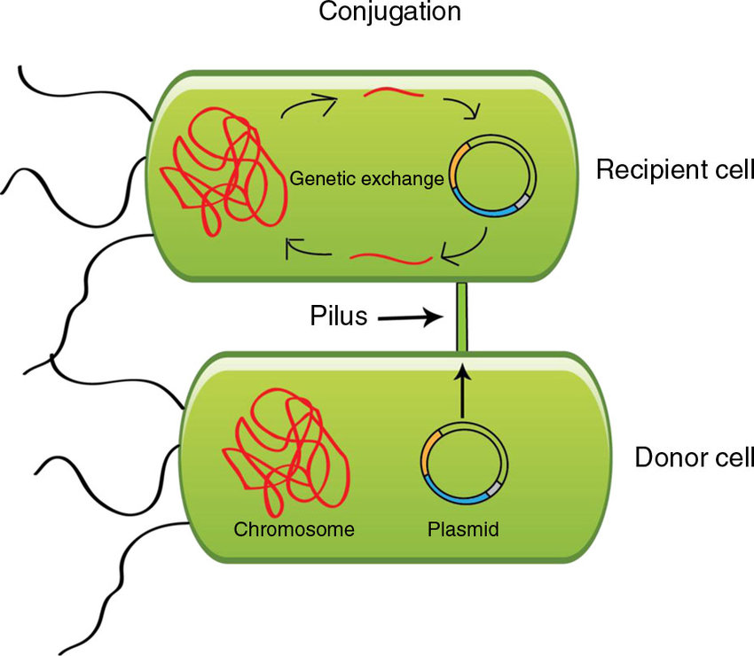 Transfer of genes between bacteria is done through Horizontal Gene Transfer (HGT) in which a process called bacterial conjugation takes place. Bacterial conjugation allows plasmid’s from a donor bacterium to pass over a ‘small bridge’ to the recipient cell. The small bridge is called a pilus (seen in the diagram of a bacterial cell above) which is made from a Fertility (F) Factor in the episome of a cell (the F Factor and episome code for the pilus formation).