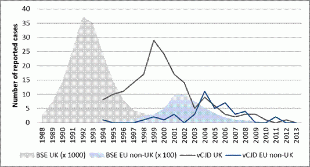 On the graph you can see the grey lines, showing the cases of BSE and vCJD in the UK. There was a steep increase during the early 90s of BSE, and in the late 90s for vCJD. However, you can also see it has declined a considerable amount. Prions are still rare but they are very deadly with little advancements in medicine to combat them. They are so small and specific it is difficult to target them like we do for viruses and bacteria.