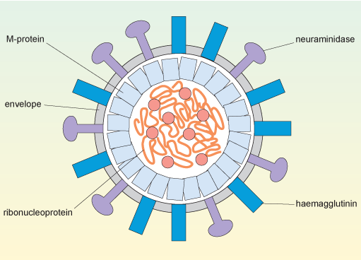 In the photo on the left you can see the structure of the influenza virus. The haemagglutinin is the HA spike on the membrane of the virus which is responsible for how the virus enters human/host cells. Credit: The Open University