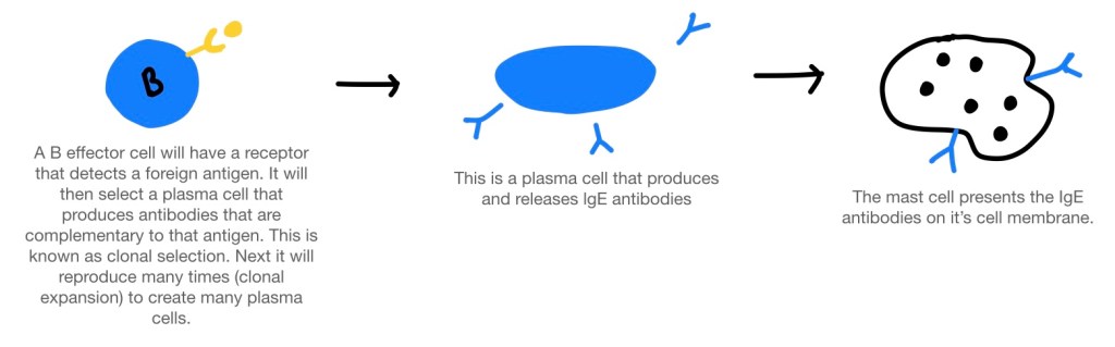 When an allergen first enters the body it is the first time the immune system has been exposed to it’s antigen. The immune B cells will produce plasma cells that produce and release IgE antibodies that are complementary to the antigen. This means the antibody can form a complex with the antigen. The IgE antibodies will then be presented on a specific type of cell called a mast cell. This is a process known as sensitisation.