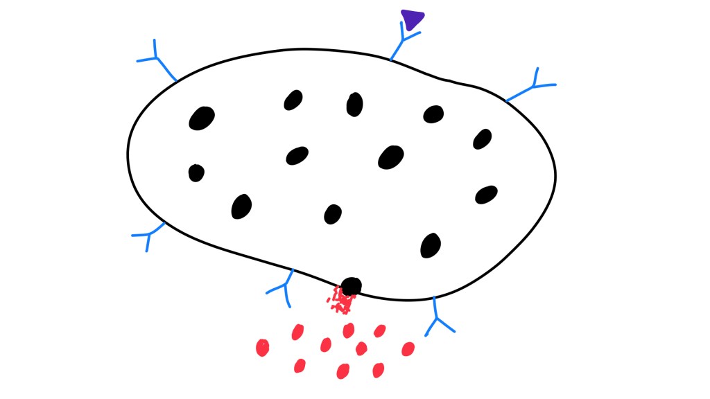 This is a mast cell. It has IgE antibodies presented on it’s cell membrane which are a complementary shape to the allergen. The mast cell contains granules (the sacks in the middle) which contains chemicals that play a role in inflammation and allergic reactions. Usually, they are found in the lungs, gastrointestinal tract and skin which are common areas were symptoms of allergic reactions appear.