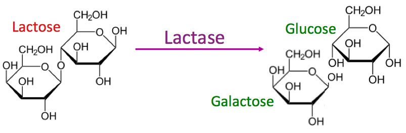 The absence of an enzyme will mean a substance is not broken down, therefore, it will build up. Often this can cause build up in the large intestine and stimulates the production and overgrowth of bacteria. These bacteria will usually be beneficial to our gut but too many will produce an excess of substances and waste. As a result, symptoms to do with digestion will arise such as diarrhoea and gas. For example, lactose intolerance is caused by the lack of lactase (an enzyme that breaks down lactose into glucose and galactose).